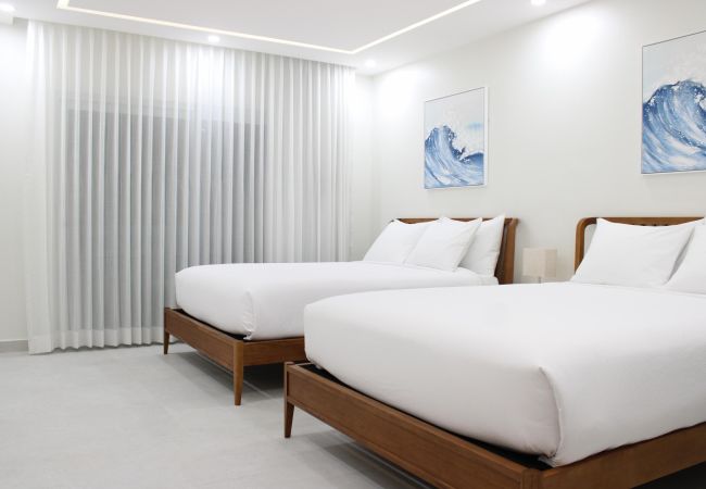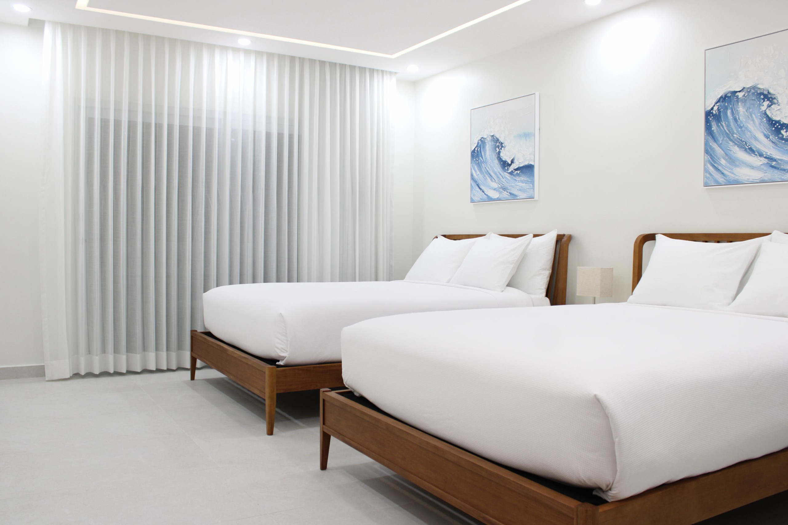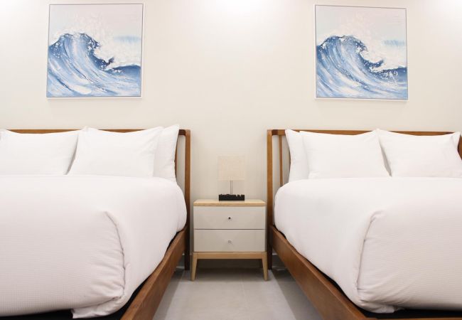 The apartment features one spacious bedroom with two queen-size beds dressed in premium bedding, comfortably accommodating up to 4 guests. The room is thoughtfully furnished with closets and ample storage space, creating a cozy and organized environment for your stay.