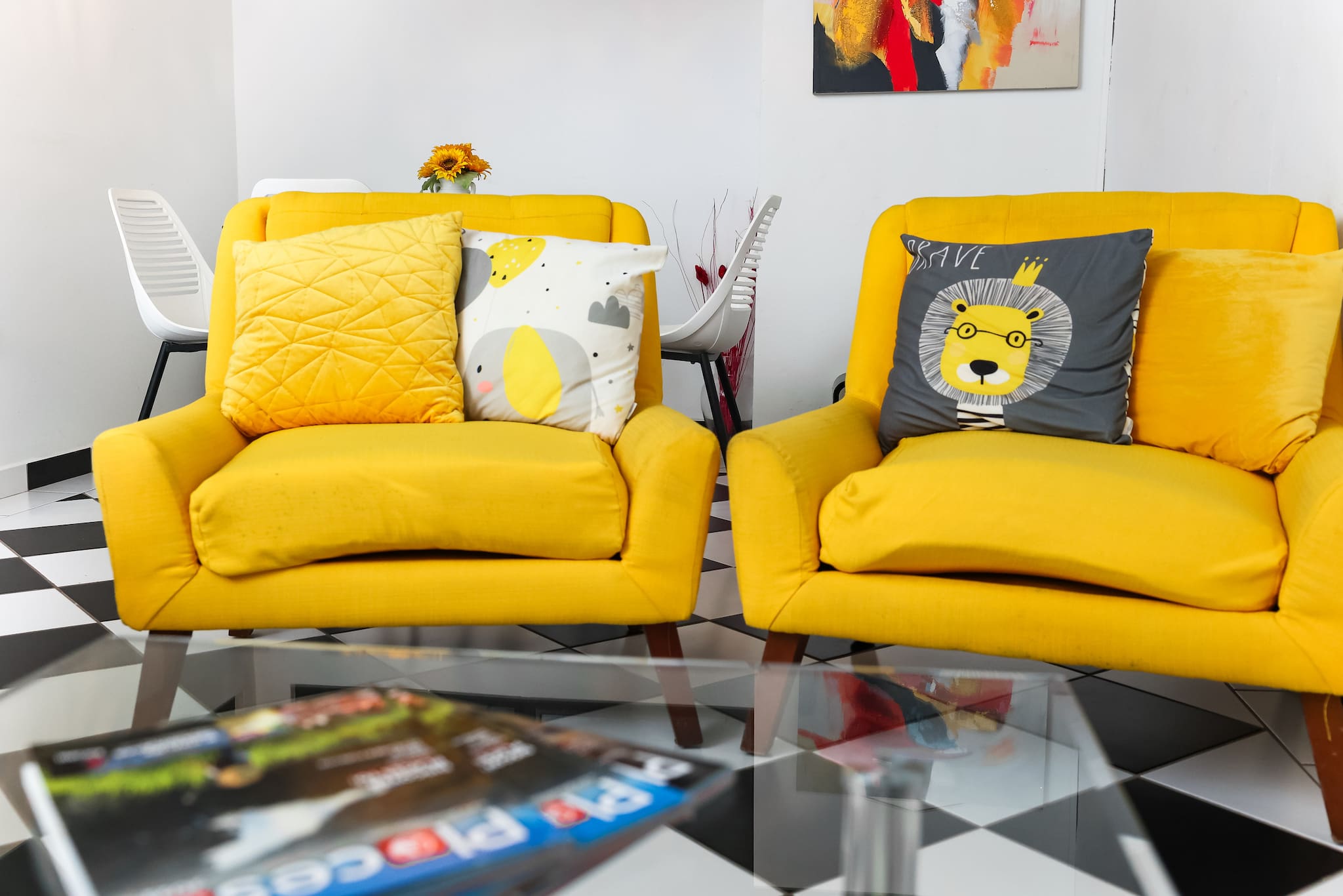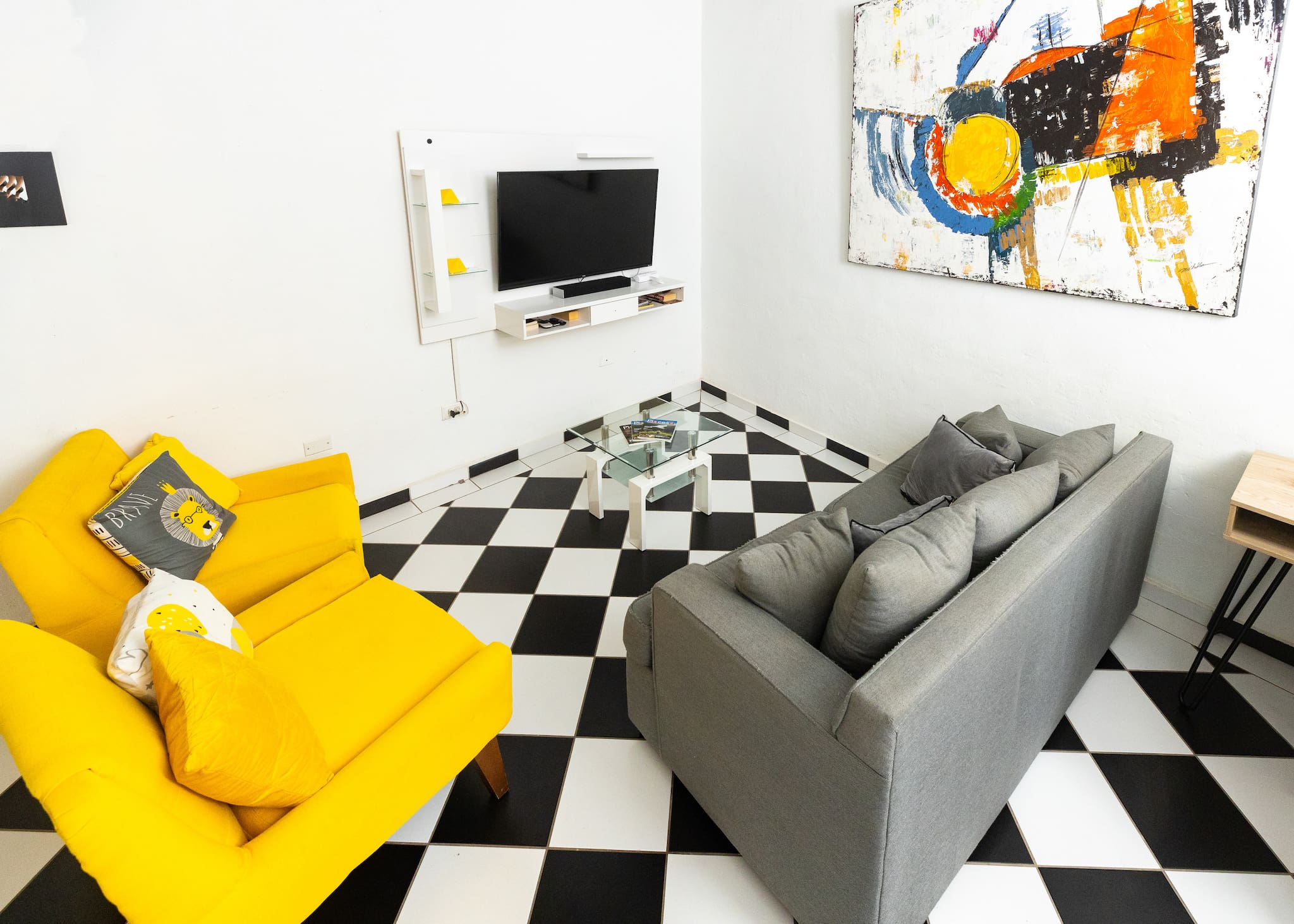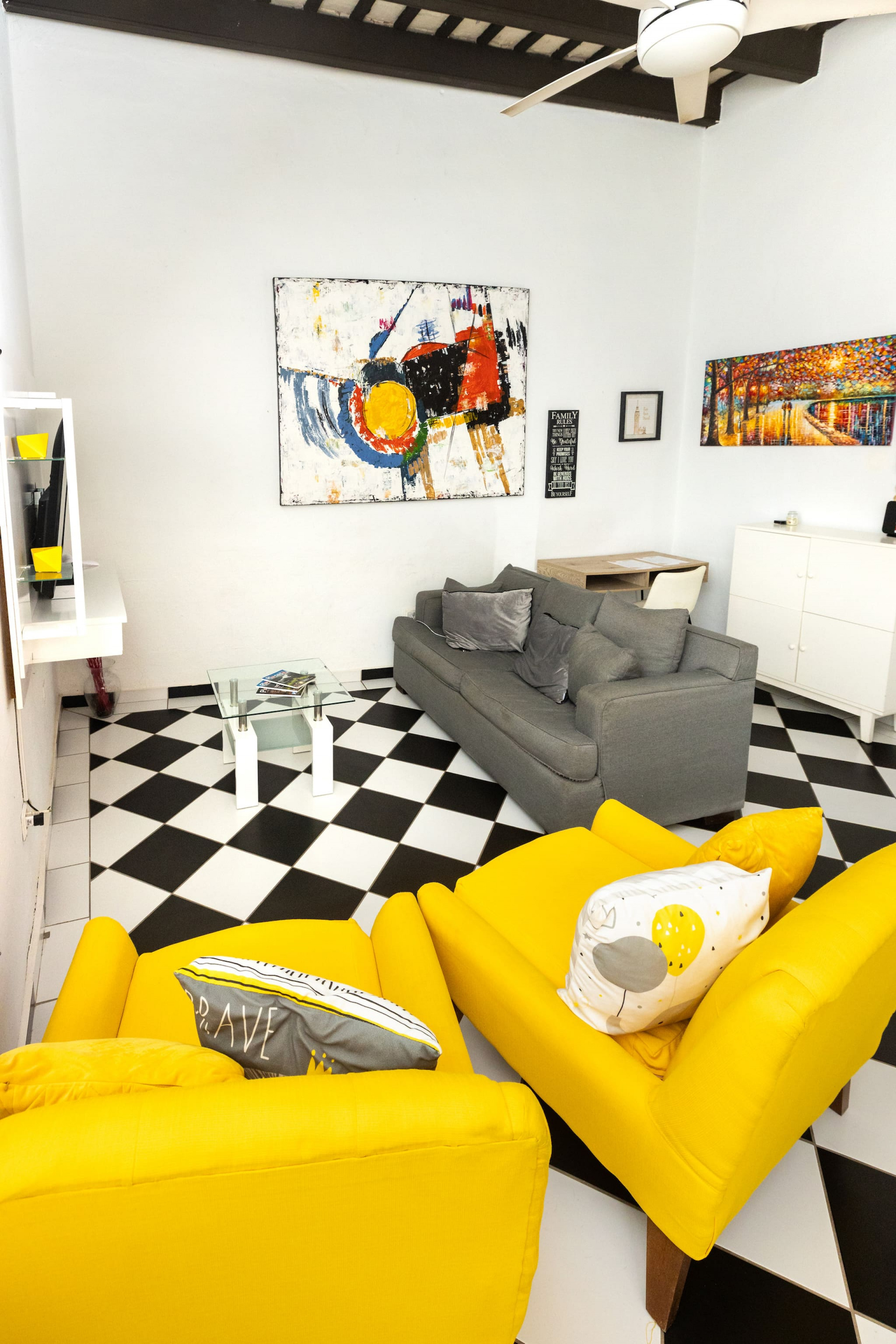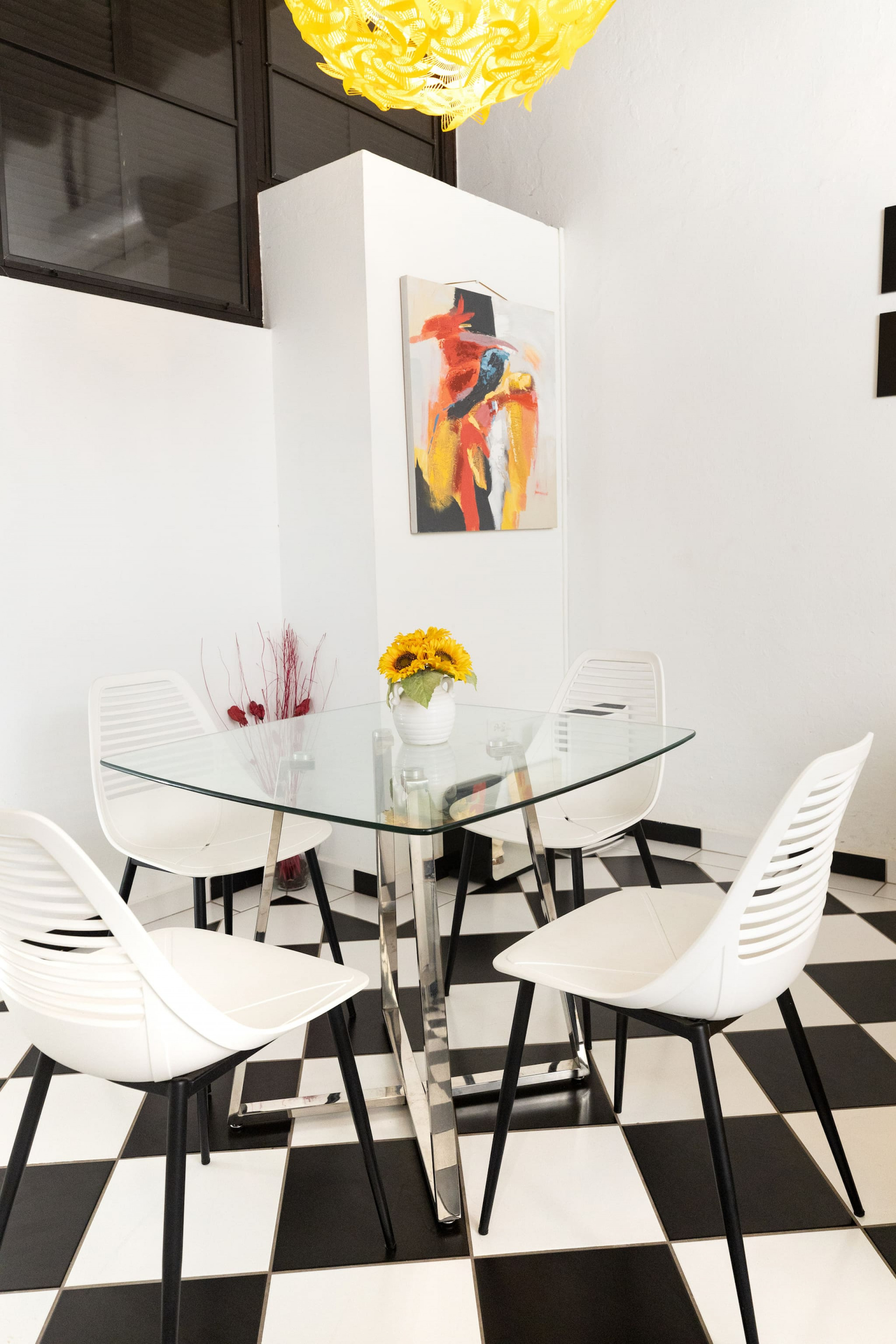 The living room is bright and spacious, accommodating up to 4 guests comfortably. The large, comfortable sofa is perfect for lounging after a day of sightseeing or enjoying a quiet evening in. Take in the stunning views of the vibrant Miramar neighborhood through the expansive floor-to-ceiling windows. Whether you're having a morning coffee or an evening cocktail, this area provides a relaxing atmosphere with plenty of natural light.